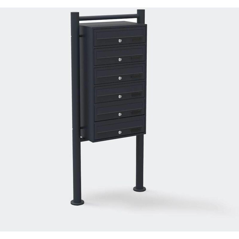 Cassetta delle lettere in acciaio su gambe con 6 ingressi Ogni casella di posta ha la propria finestra di tag per il nome. 2 chiavi sono fornite per ogni casella di posta elettronica Il supporto è già premontato, è possibile posizionare le cassette postali sul supporto con le viti in dotazione. Materiale di montaggio incluso Dati tecnici Materiale: acciaio zincato Verniciatura a polvere nera in nero Dimensioni del piede di sostegno: 150 x 5cm Dimensioni cassetta delle lettere: 27 x 38,5 x 70cm Altezza dei piedi: 1,50m Dimensioni del cartone: 42 x 31 x 73cm (9.7Kg) - 15 x 14 x 154 (5.5Kg) Peso: 15kg