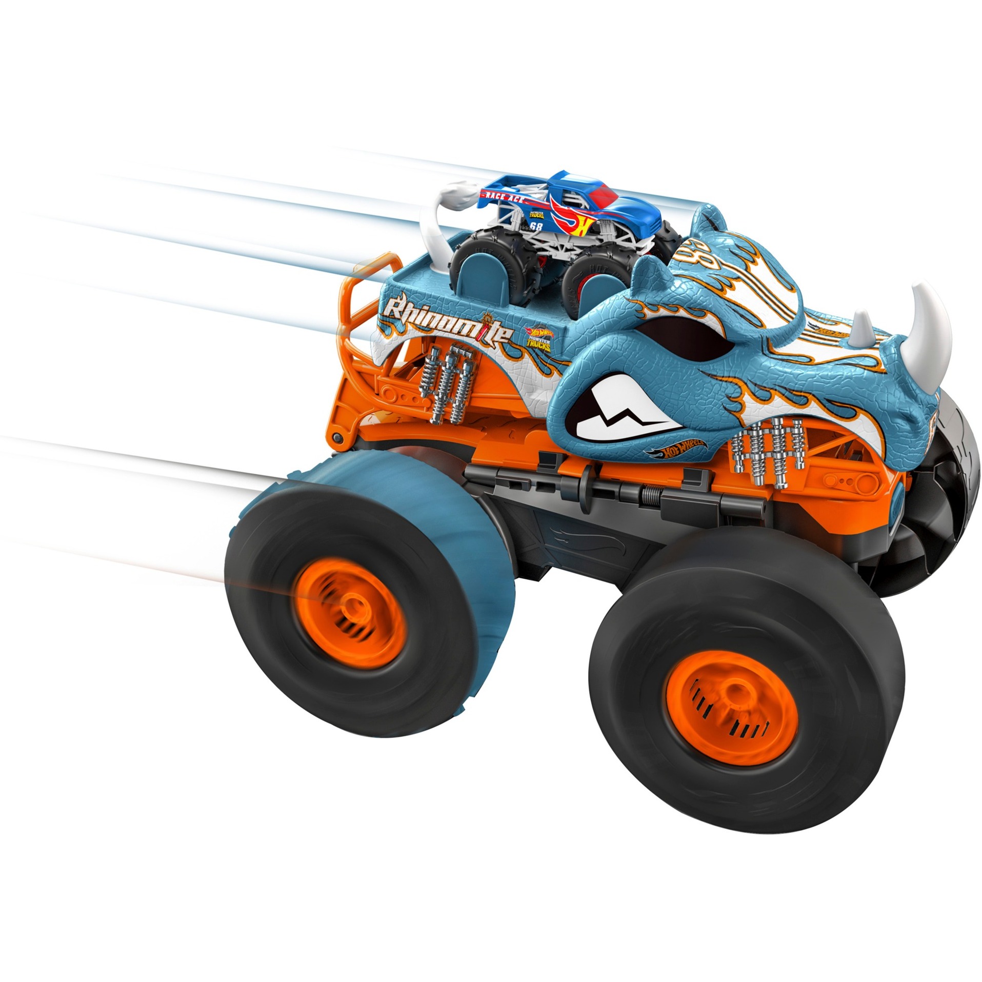 Con la Hot Wheels Monster Trucks HW convertibile, convertibile Rhinomite, ci sono un sacco di incidenti, acrobazie e manovre di accelerazione! Questo monster truck telecomandato in scala 1:12 presenta ruote enormi, decorazioni autentiche e modalità dinamite. Il grande monster truck può essere trasformato in un acceleratore motorizzato per monster truck più piccoli in scala 1:64. Può lanciarli in aria fino a circa 90 cm di altezza! È incluso un Race Ace in scala 1:64: può essere riposto nella parte posteriore del camion più grande durante il gioco telecomandato, e poi lanciato dall''acceleratore dopo la grande trasformazione. Ciò consente di eseguire trucchi interessanti come 360 impennate e velocità fino a 10 km / h.