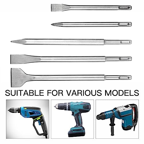 HPMAISON Scalpelli SDS-plus 5pcs, Set di Scalpelli per Piastrelle SDS Plus e scalpelli in Calcestruzzo, 3 Scalpelli Piatti e 2 Scalpelli a Punti per Calcestruzzo, Mattoni, Cemento, Pietra e Muratura