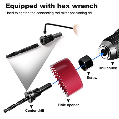 Facile da usare: tutti gli strumenti necessari per un cambio facile e veloce. Una chiave esagonale e piastra di installazione sono inclusi per l'installazione dell'utensile. Sostituire rapidamente e facilmente le seghe per la necessità di fori di diverse dimensioni. La lama della sega è facilmente fissata a un trapano elettrico per il taglio dei fori.