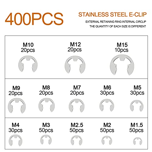 Alta qualità: anello a scatto esterno con clip a E realizzato in acciaio inossidabile, con una superficie liscia e lucida, ha un'elevata durezza e una lunga durata con ottime prestazioni in resistenza alla ruggine e alla corrosione.