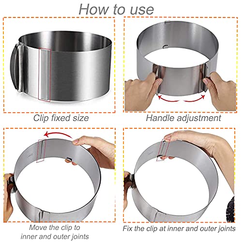 Due cerchi da pasticceria di dimensioni diverse: due stampi rotondi regolabili per pasticceria, il grande cerchio da pasticceria può essere regolato con diametro di 16-30 cm, altezza 8 cm, il piccolo cerchio da pasticceria regolabile in diametro di 6-10 cm, altezza 5 cm, gli accessori da pasticceria ampiamente utilizzati in cucina