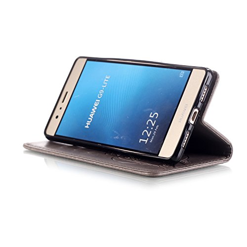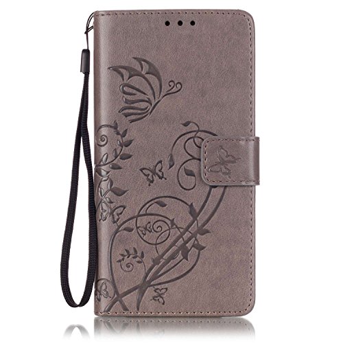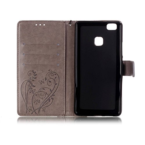 Huawei P9 Lite Custodia,Funyye Huawei P9 Lite Pelle Libro Copertura Con Cordino Shell Supporto Stand Porta Carte Portafoglio Flip Wallet Cover Chiusura Magnetica Proteggi Caso Elegante Fiori e Farfalle -Grigio