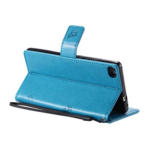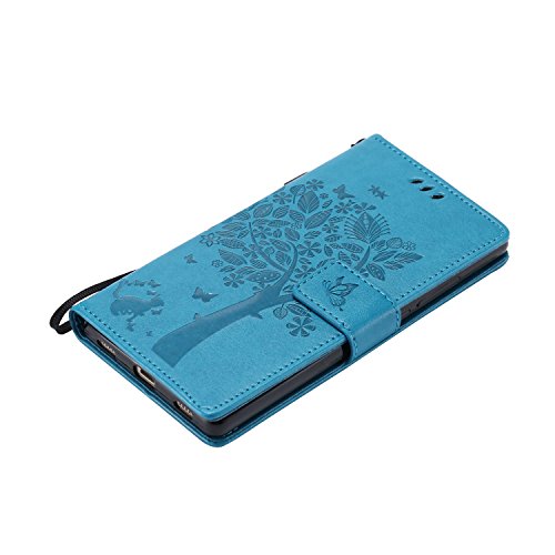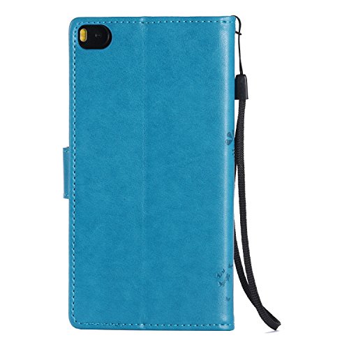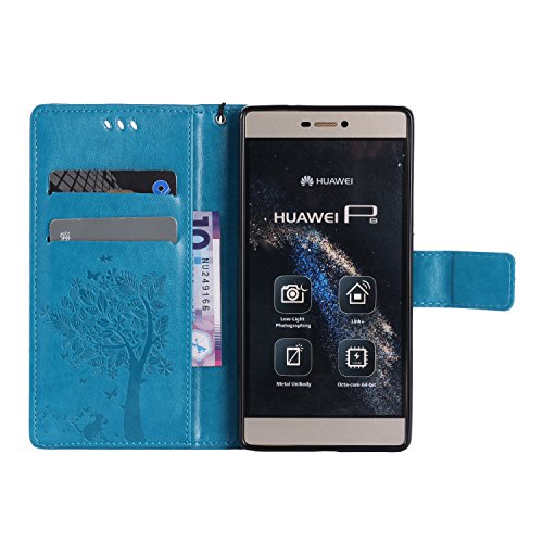 Huawei P8 Custodia,Huawei P8 Custodia in Pelle,Cover Huawei P8,Cozy Hut Cute Case Cover per Huawei P8 con PU Pelle Custodia in Pelle Protettiva Flip Portafoglio Case Cover con Strap / Supporto di Stand / Carte Slot / Chiusura Magnetica (cartoon gatto e albero) - blu