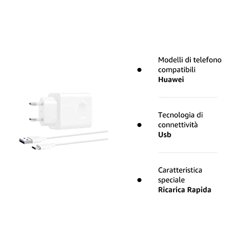 Il caricatore da parete HUAWEI SuperCharge (max 22,5 W SE) fornisce una porta USB di tipo A che supporta tre modalità di uscita: 5 V / 2 A, 9 V / 2 A e 10 V / 2,25 A (22,5 W massimo)