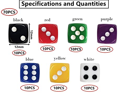 HUAZIZ 70 Pezzi Dadi 6 Facce 12mm Dadi da Gioco per enzi, Farkle, Yahtzee, Bunco or Insegnare i Matematici, 7 Colori