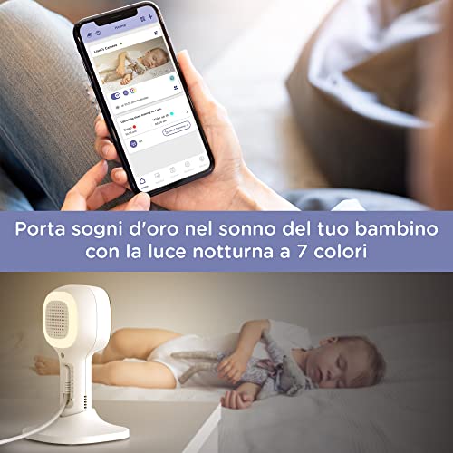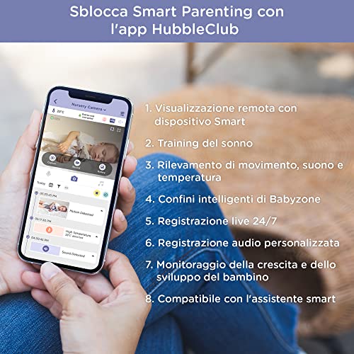 PAN, TILT, ZOOM, VISIONE NOTTURNA DA REMOTO: Guarda l'intera stanza, giorno e notte, con panoramica, inclinazione, zoom e visione notturna ad infrarossi da remoto Avvicinati ai tuoi cari, a distanza, attraverso l'unità di controllo del monitor video. PRODOTTO SMART - App Hubble e guarda/vedi/ascolta/parla con il tuo bambino da qualsiasi luogo.