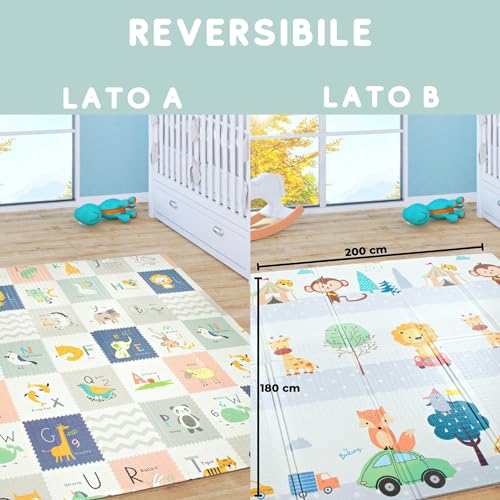 HuBorns - Tappeto Gioco Bambini Pieghevole 200x180 cm, Reversible, Impermeabile e con Bordi Cuciti, Tappeto Gioco Neonato per una Sicurezza Extra per il Neonato, Morbido Tappeto Neonato Gattonamento