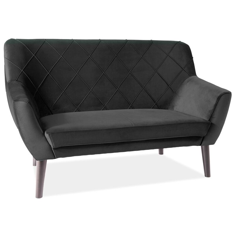Questo divano è un elegante mobile a due posti. Lo schienale è imbottito. Il set è rivestito in velluto, un materiale piacevole al tatto e facile da pulire. La seduta del divano ha una forma molto ergonomica che assicura un adeguato livello di comfort. Le gambe dell'armadio sono stabili, solide, in legno. PUNTI FORTI: stile glamour sedile ergonomico Finitura: sedile e schienale imbottiti in velluto nero, gambe in legno colore wengè Struttura stabile e robusta facile da mantenere CARATTERISTICHE TECNICHE: larghezza 136 cm profondità 75 cm altezza 90 cm Materiale: velluto, legno un autoassemblaggio
