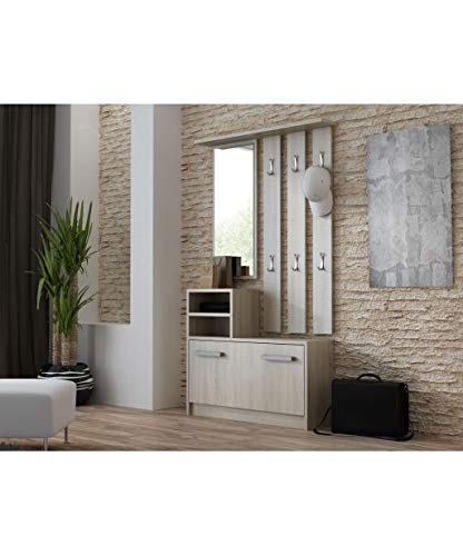 Hucoco VITTORIA | Mobile da ingresso moderno con 6 ganci + specchio + scarpiera 180x85x24 | Guardaroba | Effetto legno