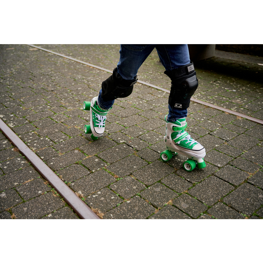 Dettagli del prodotto: Età: da 5 anni Telaio in PP resistente agli urti con alluminio Truck Regolabile in 4 taglie, incluse 4 solette coordinate Polsino in TPE e puntale in nylon Power -trap Fibbia a pressione Ruote in PU fuso, ad alto rimbalzo, cuscinetti a sfera 82A ABEC 3, linguetta comfort in carbonio Dimensioni e peso: Dimensioni dell'imballaggio (lunghezza x larghezza x altezza): 41,5 x 34 x 12 cm. Peso: 3,21 kg Misura della scarpa: 32-35 Dimensione ruota: Ø 60 x 37 mm con peso massimo dell'utente di 60 kg Materiale e cura: Materiale: PP, alluminio, PU Cura: pulire con un panno umido