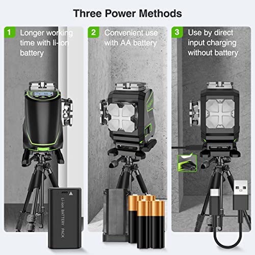 ✔️TRIPLE POWER METHODS&TYPE-C PORT: This 360 laser tool adopted large capacity Li-ion battery (can be purchased easily at local market) for extended run-time, or with 4 AA alkaline batteries. Huepar 360 laser level comes with a holder for installing 4 AA batteries to use the tool. Besides, this laser tool can be used at job site by plugged in when taking out the battery. With Type-C charging port, the laser level can also be charged by phone, laptop, power bank, car charger, etc.