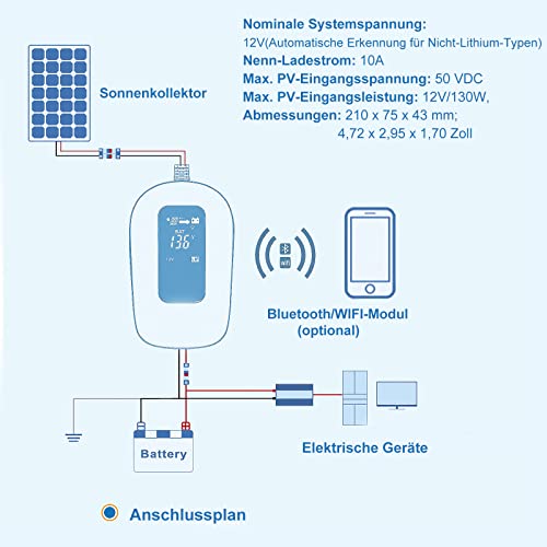 HUGOOME MPPT - Regolatore di carica solare 50 V 10 A 12 Volt per batteria al litio AGM LiFePO4, Bluetooth integrato con app iConnect per smartphone (MPT-10ABT)