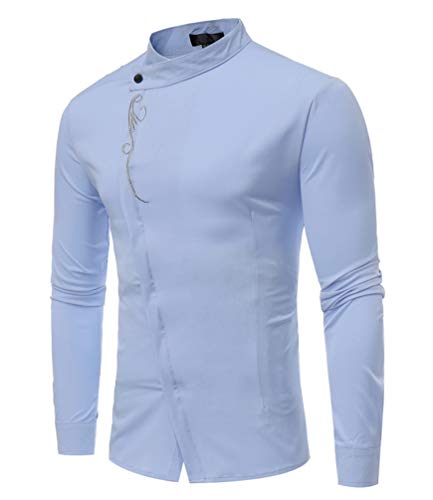 Huixin Camicia da Uomo Slim Fit Manica Lunga Irregolare Camicia Camicetta Maschi Diagonale Pulsante Collo Coreana Camicie con Ricamato Design (Blu,XL)