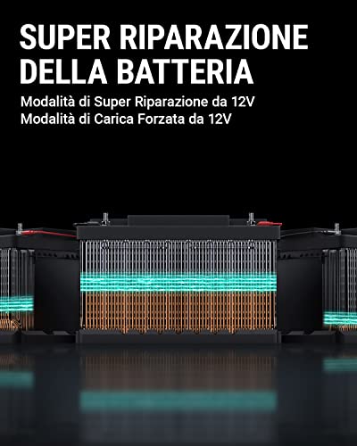【360° Diagnosi e riparazione della batteria difettosa】: Rileva automaticamente la solfatazione della batteria e la stratificazione acida della batteria e, se possibile, recupera la batteria e la sua potenza tramite la tecnologia di riparazione a impulsi, che pulirà la solfatazione e la stratificazione acida.