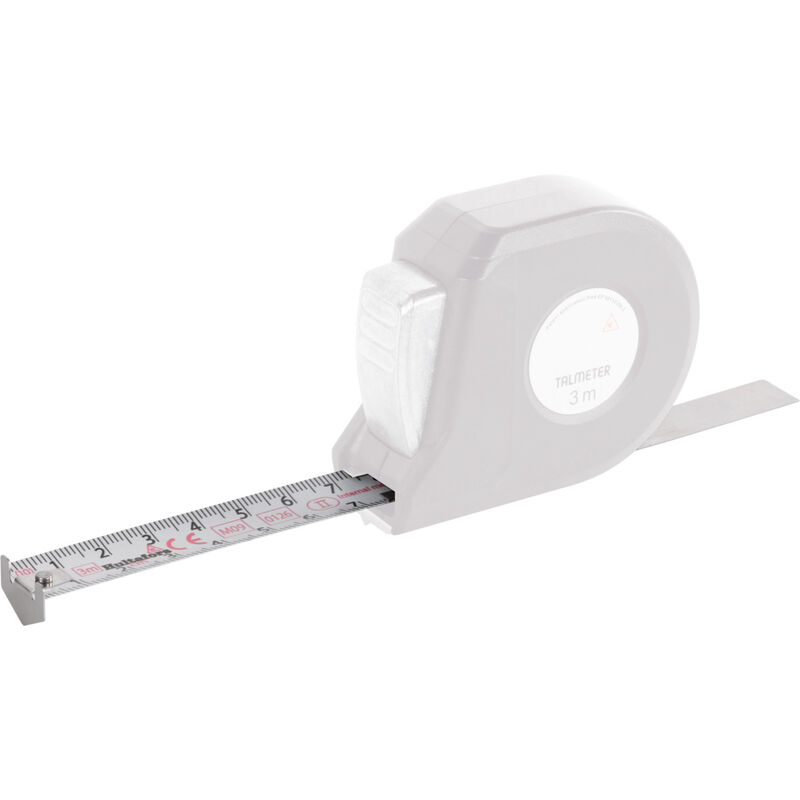 Flessometro di ricambio per il calibro di marcatura TALMETER n. art. 465690 Punta di misura e di tracciatura in acciaio inox temprato per molle. Cifre nere = dimensioni esterne. cifre rosse = misure interne. Dati tecnici Tipo di prodotto Flessometro Norma EG II Lunghezza del nastro, m 6 Larghezza del nastro, mm 16
