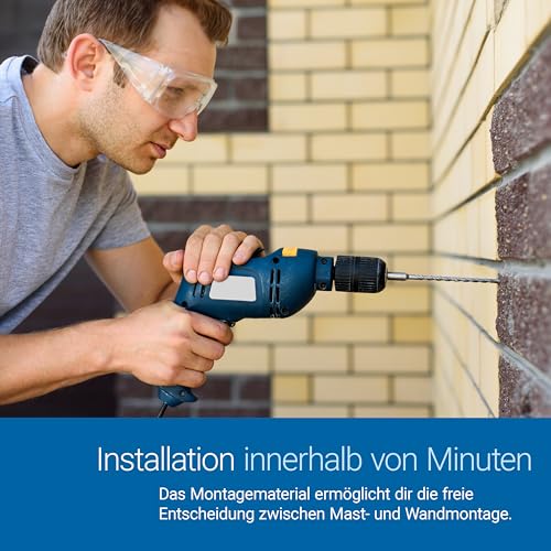 Contenuto della confezione: antenna satellitare, supporto da parete combinato e asta, istruzioni in D, GB, F, IT), bussola, chiave per il montaggio