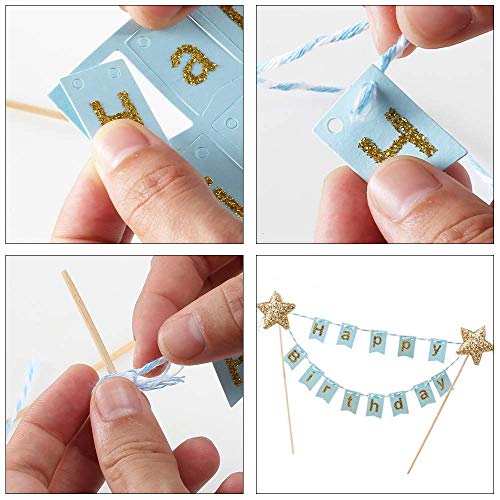 Riceverai 2 pezzi bandierine di cake topper compleanno con stelle lucenti (blu, rosa), ogni colore include un banner "Happy Birthday", 2 stringhe, 2 stelle d'oro e 2 bastoncini di legno, perfetti per decorare i bambini della torta compleanno.