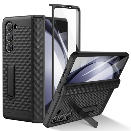 HWeggo Custodia per Samsung Galaxy Z Fold 5 con Schermo in Vetro Temperato Incorporato&Protezione Della Cerniera a molla e Kickstand,Antiscivolo Texture,Antiurto Rigido Cover per Z Fold 5,Nero