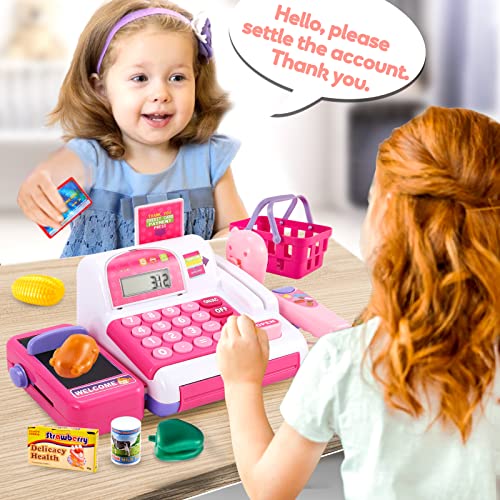 HYAKIDS 32cm Grande Registratore di Cassa Supermercato Giocattolo, 36 Pezzi Cassa per Bambini con Scanner, Nastro Trasportatore, Luci e Suoni, Giochi Bambina 3 4 5 6 Anni (Rosa)