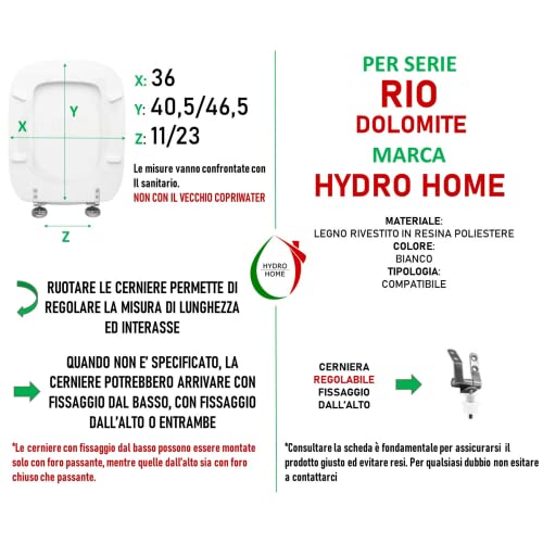Hydro Home Tavoletta Wc Compatibile con serie Rio della ceramica DOLOMITE, Tavoletta Water con Cerniere Regolabili Fissaggio dall' Alto MADE IN ITALY
