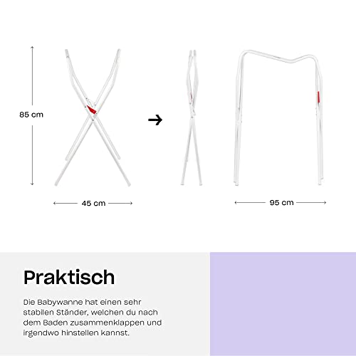 FACILE DA USARE - Il supporto universale per vasca deve essere posizionato in un luogo adatto in modo che non possa ribaltarsi. Una volta agganciata, posizionare la navicella sui supporti. Quindi versare l'acqua. Dopo il bagno del bambino, è meglio scaricare l'acqua in uno scarico con un tubo.