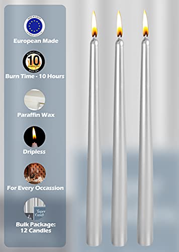 Hyoola Candele Lunghe a Cono 30 cm - Candele Coniche Senza Profumo Antigoccia - Candele Colorate Argento Metallizzato - Candele Lunga Durata 10 Ore - Set Candele Affusolate da 12
