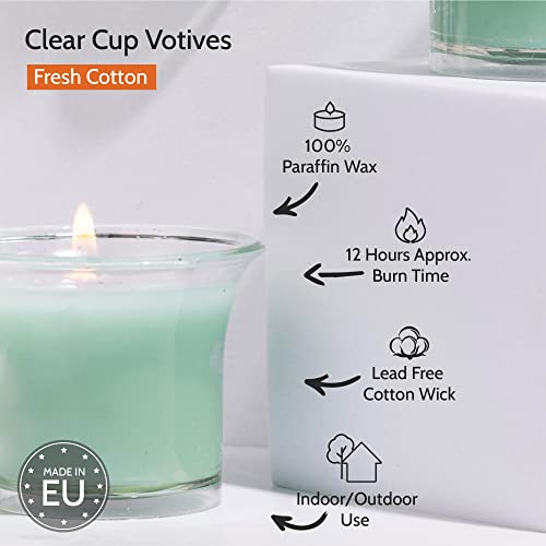 Hyoola Candele Profumate Votive con Portacandele Trasparente - Candele Profumate Piccole Cotone Fresco - Durata Candela Votiva 12 ore - Set Candele Profumate da 4 - Made in EU