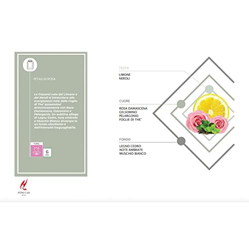 Petali di Rosa: Le frizzanti note del Limone e del Neroli si intrecciano alle energizzanti note delle Foglie di The' sposandosi armoniosamente con Rosa Damascena, Gelsomino e Pelargonio. Un sublime sillage di Legno Cedro, note ambrate e Muschio Bianco divampa in un fondo sfavillante e dall'intensità ineguagliabile.