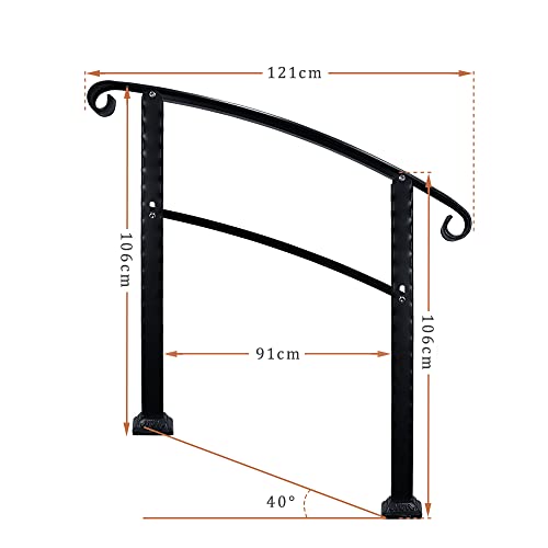 Ferro battuto di grosso spessore: il corrimano per scale in ferro battuto nero opaco è antiruggine e facile da pulire. Lunghezza del corrimano: 122 cm, altezza del palo di supporto: 106 cm, lunghezza del binario centrale: 90 cm, carico massimo: 180 kg