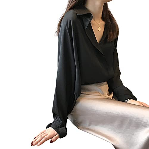HZPHQY Elegante Raso Seta Manica Lunga Camicetta Button Down Camicia Formale Lavoro Camicetta Top, Nero, L
