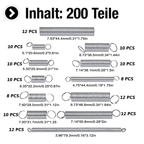 Ampia gamma di dimensioni: 8 misure di molle a compressione e 12 misure di molle di estensione, per un totale di 200 pezzi, in quantità sufficiente per essere utilizzati o sostituiti in base alle esigenze quotidiane o di manutenzione