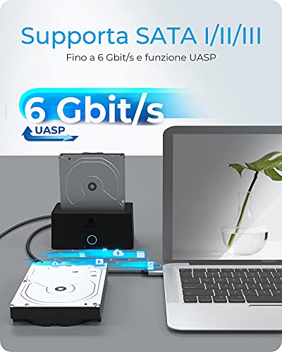 PLUG & PLAY: la docking station è compatibile con MacOS e Windows. È sufficiente collegarla, connettere il disco rigido per accedere o salvare i dati.