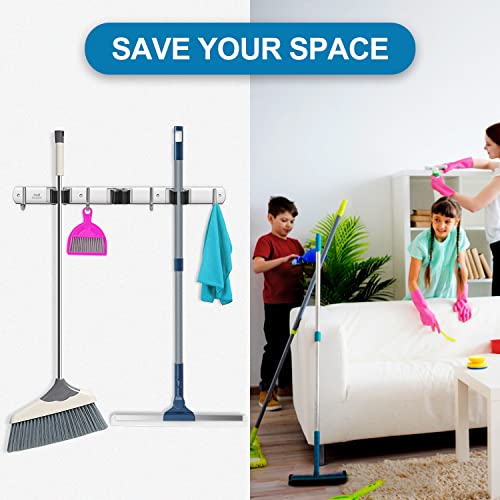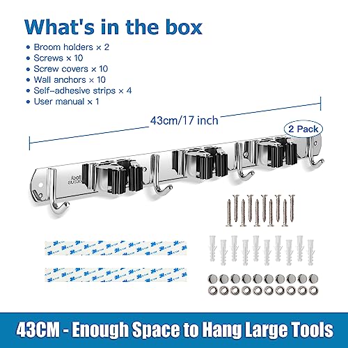 Ibell 2 Pezzi Portascope e Portaspazzole da Muro, Supporto Parete per Scopa e Porta Utensili in Acciaio Inossidabile con 6 Posti e 8 Ganci, Gancio Scopa Autoadesivo per Bagno, Giardino, Garage