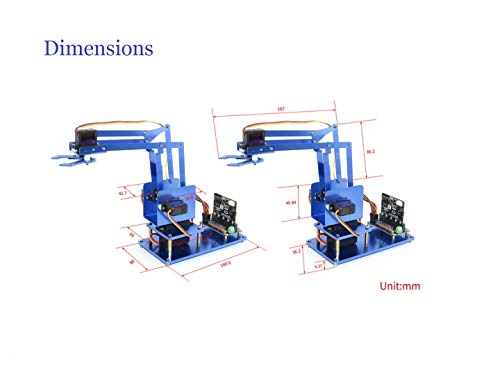 This starter robotic arm kit includes: servo driver board, metal mechanical arm structure, and 4x metal gear servos. When used with the micro:bit, it is easy to control the arm by smart phone through Bluetooth connection.
