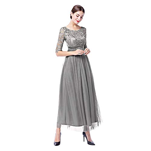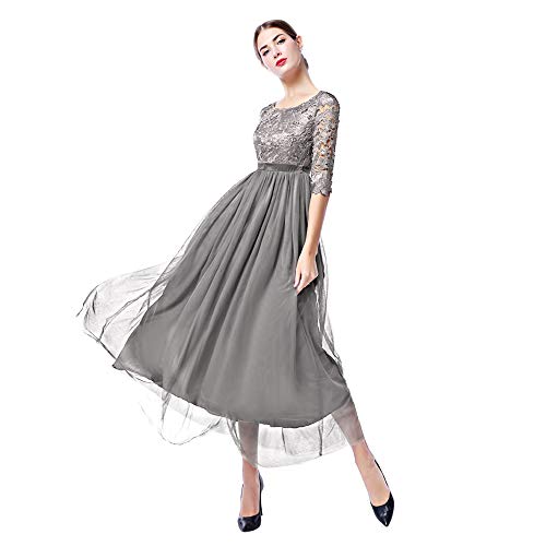 IBTOM CASTLE Maxi Abito da Donna 3/4 Manica in Pizzo Elegante Vestito da Cerimonia Matrimonio Sposa Damigella d'Onore Sera Cocktail Prom Lungo Abito da Ballo Vestito da Festa Tulle Grigio XL