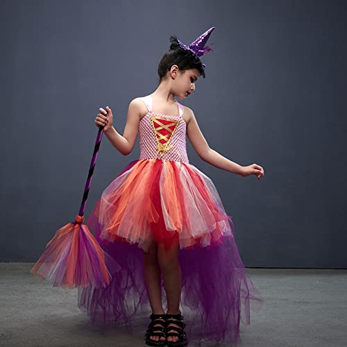♦【Abito da Strega di Lusso per Bambini】Costume da strega di Halloween da bambina per bambini, vestito da festa di carnevale cosplay con scollature quadrate senza maniche e tulle a strati, adatto a bambini di età compresa tra 2 e 12 anni.In questo costume, sei una strega da favola.