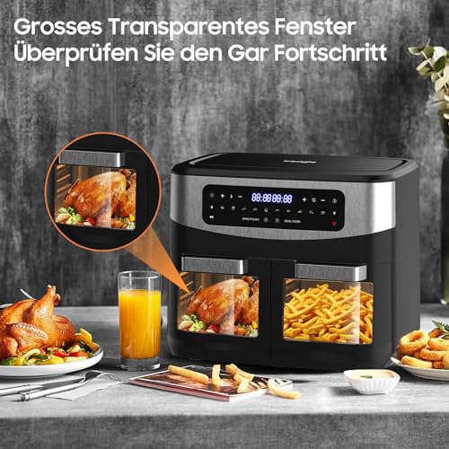 Iceagle Iceagle Airfryer - Friggitrice ad aria calda a doppia camera, 12 l, friggitrice ad aria calda con finestra di visualizzazione, 10 programmi, 2 scomparti, touch screen LED, funzione