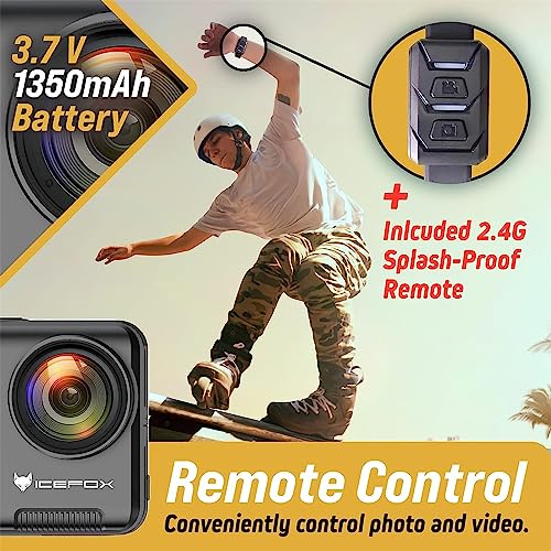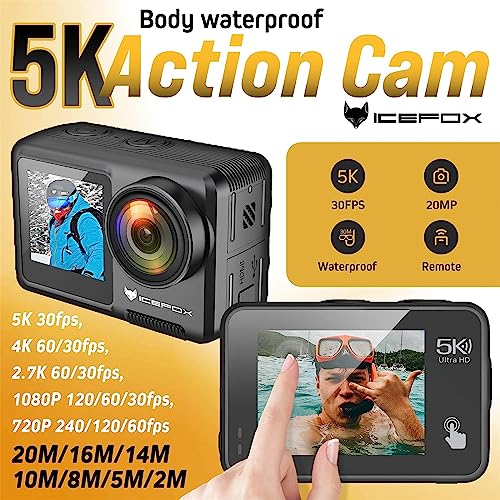 Icefox Action Cam 5K 20MP 30FPS WiFi, Fotocamera Subacquea 30M con Touch Screen, Stabilizzatore EIS 170° Grandangolare 4x Zoom, Action Camera con Telecomando e Kits di Accessori