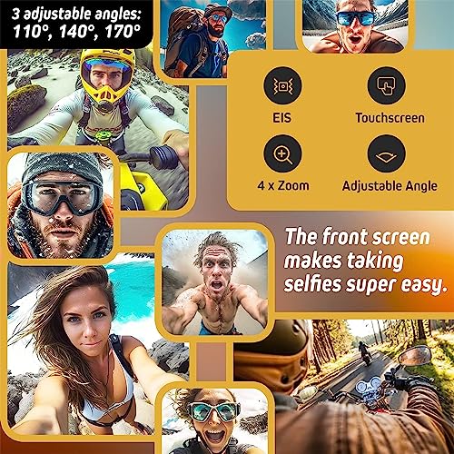 【Action Camera 5K Ultra HD e Stabilizzazione EIS】Video professionale 5K a 30fps e video 4K a 60fps con foto da 20MP fino a 30 fotogrammi al secondo per ottime foto, il che significa 4 volte la risoluzione delle normali telecamere HD. La stabilizzazione EIS ti consente di registrare video più stabili e ridurre gli effetti delle inevitabili vibrazioni in movimento. Lo schermo anteriore ti consente di fare anche selfie. Supporta schede micro SD fino a 128 GB.