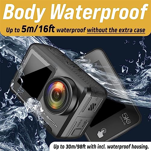 【Eccellente Impermeabilità e Modalità Subacquea】Cattura tutte le tue avventure subacquee con la Action Camera Icefox 5K, che è impermeabile fino a 16ft/5m senza custodia impermeabile e fino a 98ft/30m con la custodia impermeabile IP68 inclusa. La modalità subacquea della fotocamera migliora i colori del mondo sottomarino, ottenendo registrazioni più vivide e naturali, rendendola perfetta per nuotare, fare surf, immersioni e altri sport acquatici.