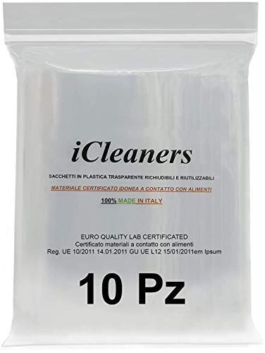 ICleaners 10 Buste in plastica Trasparente Prodotte in Italia Bustine per Alimenti richiudibili risigillabili, Chiusura a Pressione, Riutilizzabile, Molto Resistente, 100% Made in Italy (50x60)