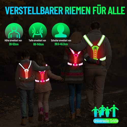 Gilet di segnalazione a LED per uomo e donna: il sistema di cinghie elastiche con chiusura a scatto si adatta comodamente a qualsiasi giacca e sei pronto per iniziare. I riflettori per bicicletta pesa solo 133 g e il gilet di segnalazione per bicicletta è regolabile in modo continuo da 135 a 200 cm di altezza e da 68 a 140 cm di circonferenza addominale. Il gilet da corsa da uomo ideale per ciclisti, motociclisti e scooter, jogging, passeggiate, scolari - gilet segnaletico a LED per tutte le attività in cui è importante essere visti al buio