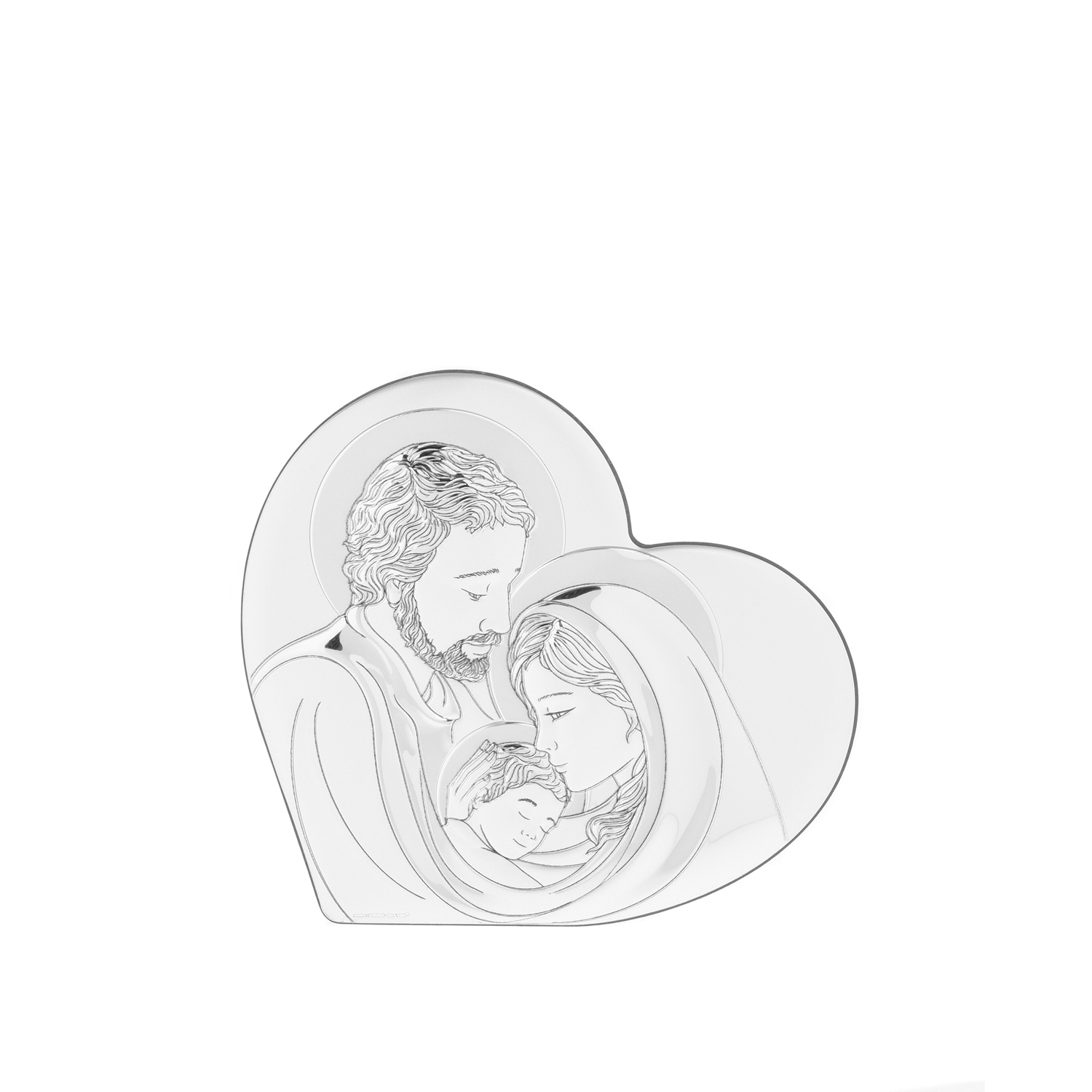 Icona Sacra finemente lavorata, risultato della lunga tradizione Beltrami, disegnata e prodotta in Italia con i materiali più pregiati. Caratterizzata da un design raffinato e di classe, può essere appesa o posizionata su una base stabile. Si adatta perfettamente a qualsiasi ambiente e stile d'arredo. Realizzata con argento Miro Silver, un innovativo metallo con trattamento superficiale, include uno strato di argento puro 999.95. Il rivestimento antigraffio possiede una durezza superiore e una resistenza maggiore all'ossidazione rispetto ai comuni rivestimenti preziosi. Ritrae la Sacra Famiglia in una sagoma a cuore. Ottima idea, per un regalo tradizionale. Dimensioni: 18x16,2 cm.