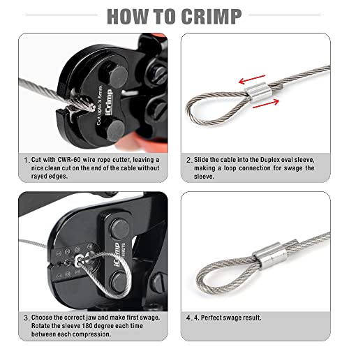 Attenzione: funziona con funi metalliche da 3/64 '' fino a 1/8 '', non utilizzare questo swager a mano su fune metallica rivestita, rimuovere il rivestimento prima di mettere l'arresto sul cavo.