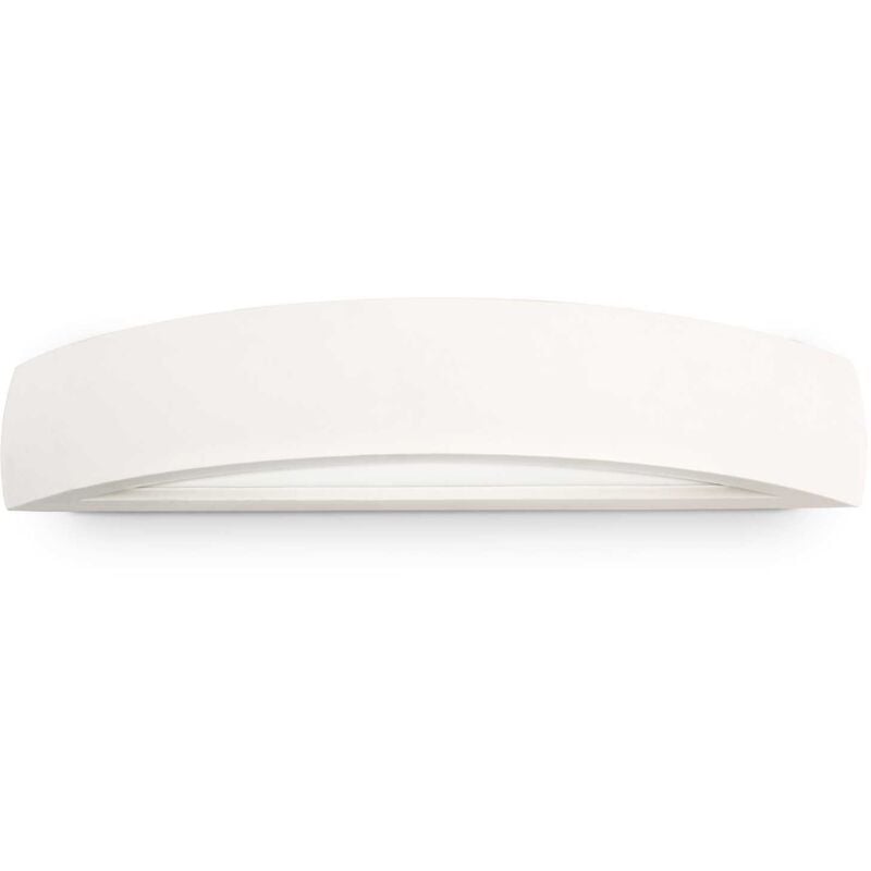 Corpo luce in gesso bianco. Base in metallo smaltato bianco. Diffusore inferiore in vetro trasparente satinato. Emissione luce sia sopra che sotto. L 510 x H 90 x P 125 mm max 2 x 40W E14 IP:20
