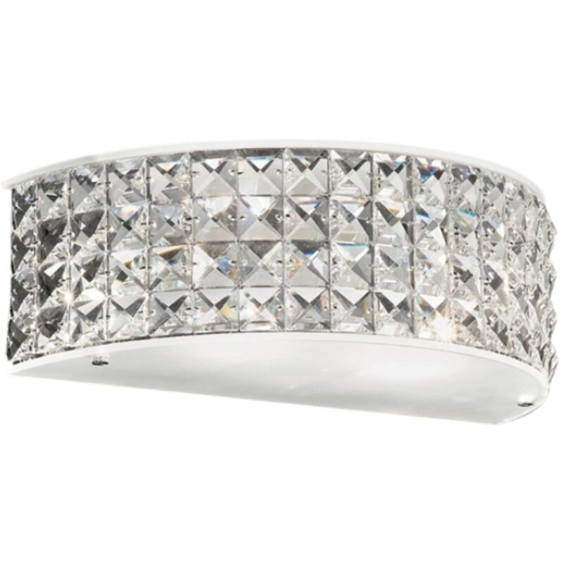 Montatura e dettagli in metallo cromato. Diffusore con elementi quadrati in cristallo molato sulla fascia laterale e vetro sabbiato sul fondo. L 300 x H 150 x P 100 mm max 2 x 40W G9 IP:20