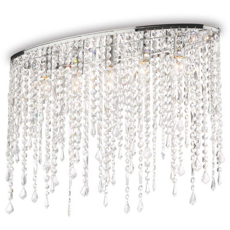 Montatura ellittica in cromo. Pendagli con elementi in cristallo molato ottagonali, quadrati, rettangolari e gocce finali. Ø 690 x H 490 x P 240 mm max 5 x 40W E14 IP:20