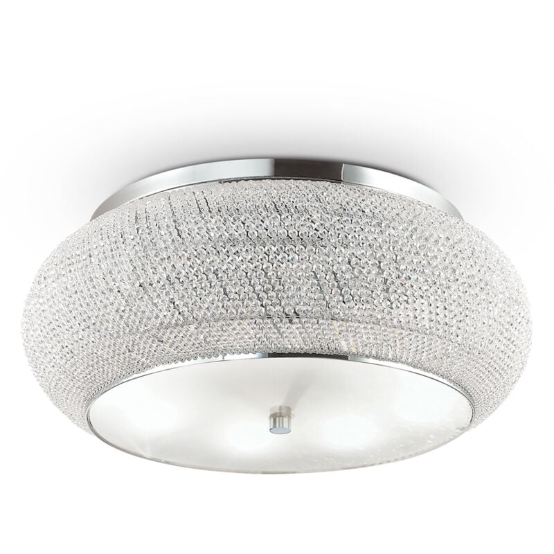 Collezione Pasha' SOVRANO INCONTRASTATO DEL TUO ARREDAMENTO Plafoniera a 14 luci con montatura in metallo cromato. Diffusore composto da filari di perle in cristallo molato e fondo chiuso da vetro circolare sabbiato.