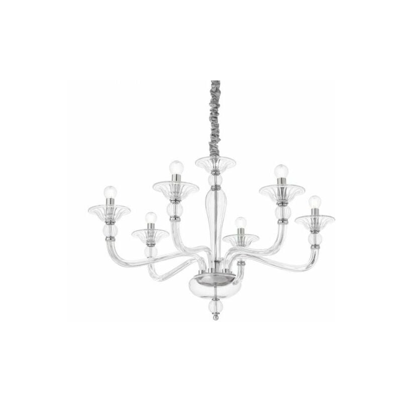 Lampadario a sospensione con montatura in metallo cromato ed elementi decorativi in vetro soffiato trasparente. Copricatena in velluto.